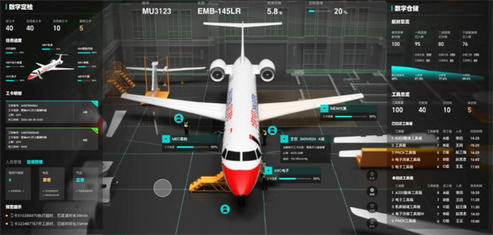 4.维修机库数字孪生:运用数字孪生技术,对维修机库进行数字化还原,实现物理机库与虚拟机库的实时同步。通过数字孪生机库,可以实时查看飞机的维修进度、设备的运行状态、人员的工作情况等信息。